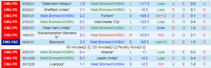 + Thống kê 10 trận gần nhất của West Brom
