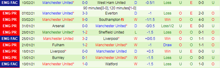 + Thống kê 10 trận gần nhất của Man United