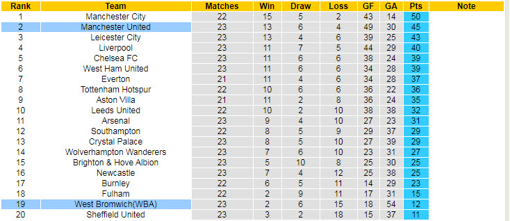 Cần nhắc lại, West Brom đang đứng ở đầu bên kia bảng tổng sắp. Cụ thể, họ chỉ có được 2 trận thắng, hòa 6 và nhận tới 15 thất bại sau 23 lượt trận, qua đó đứng áp chót trên BXH. Ngược lại, MU xếp ở vị trí nhì bảng với 45 điểm, nhiều hơn West Brom tới 33 điểm.