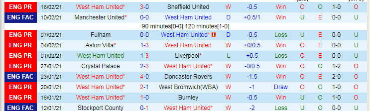 + Thống kê 10 trận gần nhất của West Ham