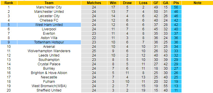 Tính tới trước vòng 25 giải Ngoại hạng Anh, “Búa tạ” thắng 12 trận, hòa 6 và thua 6 trận, qua đó đứng ở vị trí thứ 5 trên BXH và chỉ kém đội xếp thứ 4 Chelsea khoảng cách hiệu số bàn thắng thua.