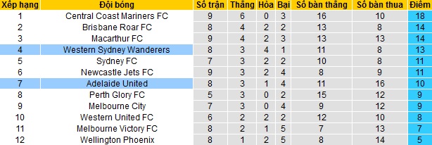 Trong khi đó Adelaide United hiện đã tụt xuống thứ 8 trên bảng xếp hạng. Với 10 điểm sau 8 vòng đấu, đội bóng đang kém các đội trong Top đúng 1 điểm duy nhất nhưng còn đang đá ít hơn 1 trận.