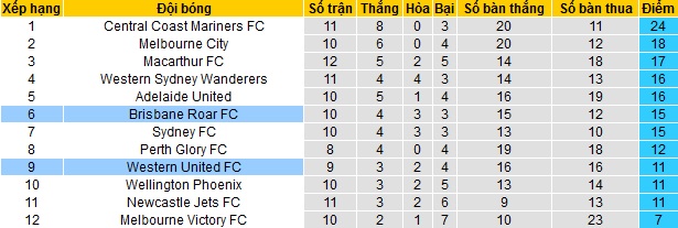 Bảng xếp hạng giải VĐQG Úc vòng 11