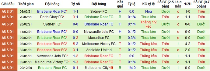Một điều đặc biệt là trong cả 4 lần đối đầu giữa hai đội, phần thắng lại đều thuộc về đội khách. Tuy nhiên với phong độ kém cỏi của Brisbane Roar khi đã 5 trận liên tiếp không biết đến chiến thắng, nên có lẽ chọn cửa trên ở trận đấu này có phần an toàn hơn.
