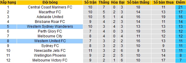 Trong khi đó Western Sydney đang có được 13 điểm sau 10 vòng đấu và đứng ở vị trí thứ 6 trên bảng xếp hạng, trong nhóm các đội có suất dự play-off. Khoảng cách của Western Sydney với các đội Top 2 hiện vẫn đang là 4 điểm