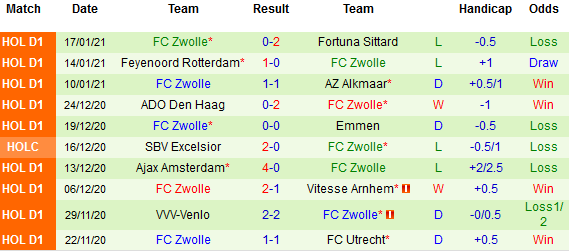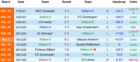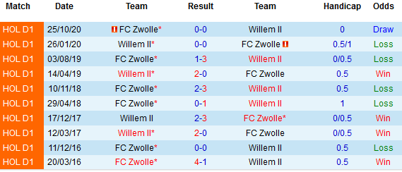 Liên tiếp 2 trận đối đầu gần đây giữa 2 đội đều khép lại mà không có bàn thắng nào được ghi. Thành tích đối đầu trên sân nhà gần đây của Willem II cũng không mang nhiều hy vọng. Trong 7 lần tiếp đón Zwolle gần nhất chứng kiến Willem II bị đánh bại tới 4 trận.