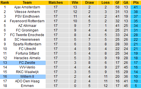 Willem II đang đối mặt với nguy rớt hạng khi với phong độ lao dốc chưa có điểm dừng như vậy. Vị trí thứ 3 từ dưới lên và chỉ hơn vị trí áp chót bảng về chỉ số phụ là hình ảnh thực sự yếu kém mà đội chủ nhà thể hiện.
