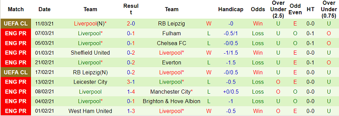 - Thống kê 10 trận gần nhất của Liverpool