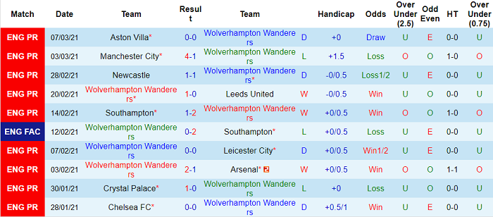 - Thống kê 10 trận gần nhất của Wolves