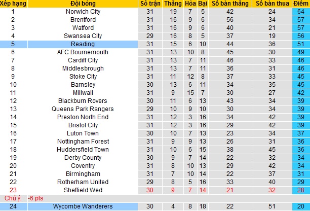 Trong khi đó Reading đang nằm trong nhóm các đội có suất dự play-off tranh vé vớt khi đứng thứ 5 trên bảng xếp hạng. Với 51 điểm có được sau 31 vòng đấu, Reading đang kém Top 2 tới 6 điểm nhưng cũng hơn các đội nằm ngoài Top 6 là 5 điểm.