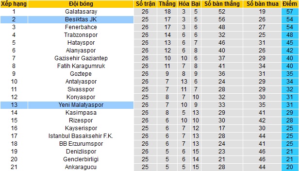 Sau 26 vòng đấu tại giải vô địch quốc gia Thổ Nhĩ Kỳ,Yeni Malatyaspor đang đứng thứ 13 trên bảng xếp hạng. Với 31 điểm có được, Yeni Malatyaspor đang có nhiều hơn nhóm các đội cầm đèn đỏ 6 điểm và đây là khoảng cách khá an toàn tuy giải vẫn đang còn 14 vòng đấu nữa.