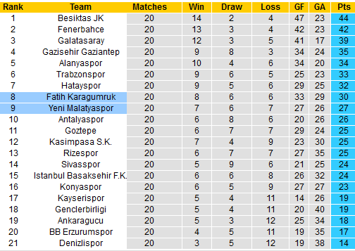 Thành tích chuyên môn kể từ đầu mùa của 2 đội không có nhiều sự khác biệt. Yeni Malatyaspor đứng thứ 9 với 27 điểm, xếp ngay sau chính Fatih Karagumruk với 3 điểm ít hơn. Nhìn vào phong độ ở thời điểm hiện tại cũng là những kết quả tương đối cân bằng.