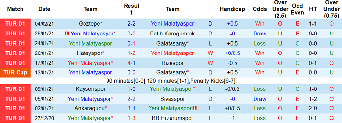 - Thống kê 10 trận gần nhất của Yeni Malatyaspor