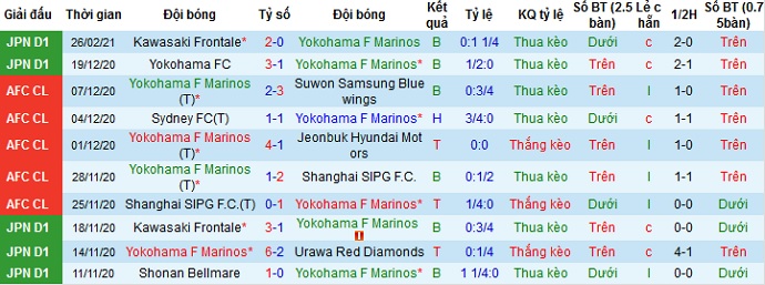 Như vậy trong 5 trận gần nhất thành tích của Yokohama Marinos là khá tệ khi chỉ thắng 1, hòa 1 và đang để thua trong cả 3 trận gần nhất.Tuy nhiên trên sân nhà nếu không tính các trận ở cúp C1 châu Á, Yokohama Marinos đang thắng 3 và để thua 2 ở 5 trận gần nhất tại đây.