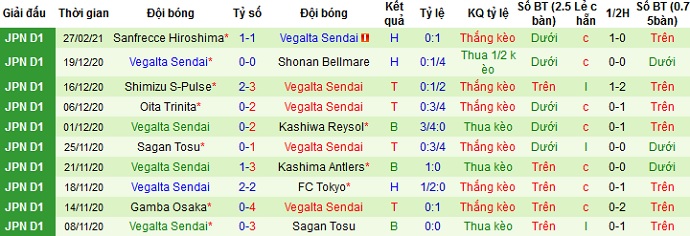 Tuy nhiên trong 5 trận gần đây Vegalta Sendai cũng có được 2 trận thắng, 2 trận hòa và chỉ để thua 1 trận. Đáng nói là thành tích sân khách của Vegalta Sendai lại đang rất tốt khi bất bại ở cả 5 lần du đấu gần nhất, trong đó có tới 4 trận thắng.