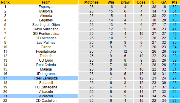 Tạm thời Zaragoza đang an toàn với vị trí thứ 17 trên BXH, nhưng họ chỉ còn hơn đối thủ cầm đèn đỏ gần nhất có 2 điểm, cách biệt hoàn toàn có thể bị san lấp khi mùa bóng vẫn còn chặng đường khá dài. Tiếp Alcorcon trên sân nhà, mục tiêu của Zaragoza là 3 điểm.