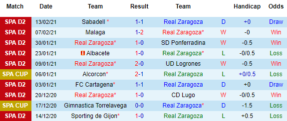 + Thống kê 10 trận gần nhất của Zaragoza