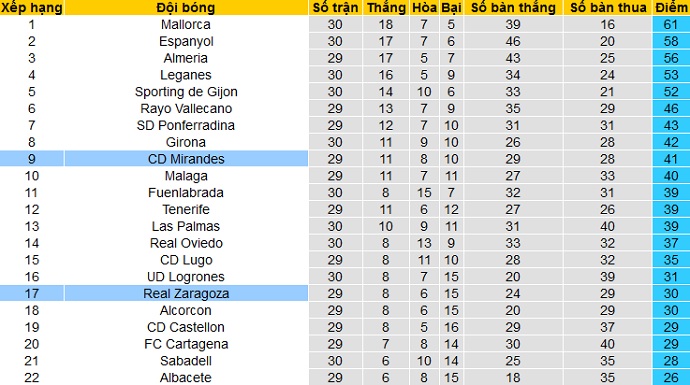 Trong khi đó Mirandés đang đứng thứ 9 trên bảng xếp hạng. Với 41 điểm có được cũng sau 29 vòng đấu, Mirandés đang còn kém nhóm các đội có suất dự play-off 5 điểm trong khi giải vẫn đang còn tới 13 vòng đấu.