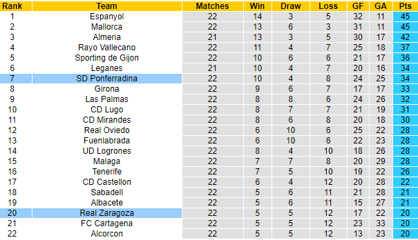Zaragoza chỉ có vị trí trong nhóm cầm đèn đỏ vào thời điểm này với 20 điểm. Tuy thế, cửa trụ hạng vẫn rộng mở với họ khi chỉ kém vị trí an toàn có 1 điểm. Nếu thắng trận này, Zaragoza hoàn toàn có thể thoát khỏi nhóm cuối. Nhưng đối phương không phải là đội bóng dễ nhằn.