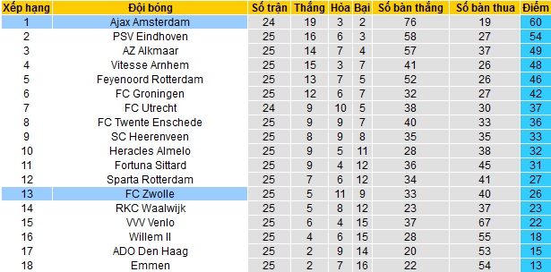 Trận đấu muộn nhất của vòng 26 giải vô địch quốc gia Hà Lan sẽ là cuộc đọ sức giữa Zwolle và Ajax Amsterdam. Hiện tại Zwolle chỉ đang đứng thứ 13 trên bảng xếp hạng với 26 điểm sau 25 vòng đấu. Khoảng cách với các đội có suất đá play-off đã là 11 điểm trong khi Zwolle chỉ hơn nhóm cầm đèn đỏ có 5 điểm.