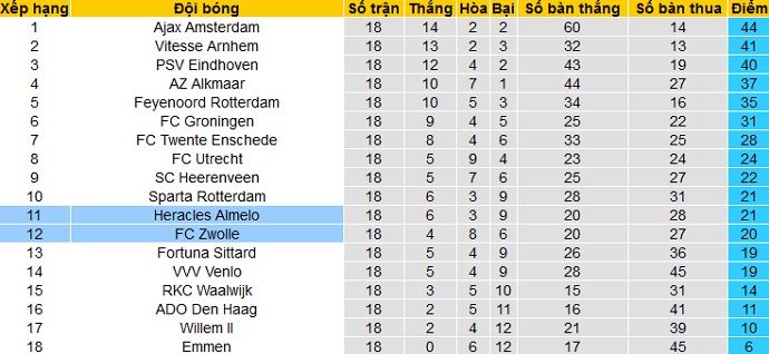 Bảng xếp hạng giải VĐQG Hà Lan trước vòng 19