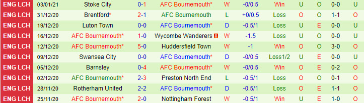 + Thống kê 10 trận gần nhất của Bournemouth