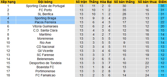 Có được 22 điểm sau 13 vòng đấu, Paços Ferreira chỉ nhiều hơn đội đứng thứ 6 Vitoria Guimaraes 2 điểm và đã thi đấu nhiều hơn 1 trận. Trong khi đó Sporting Braga đang có được 27 điểm cũng sau 13 vòng đấu và kém 2 đội đứng ngay trên là Benfica và Porto 4 điểm.