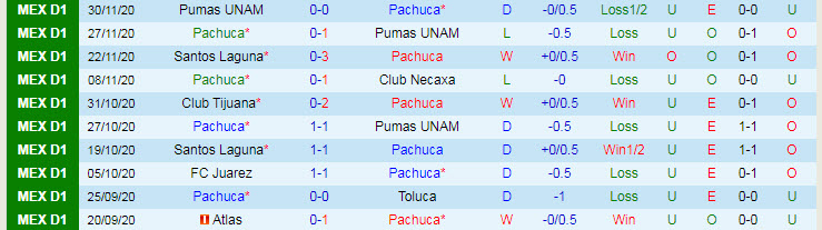 + Soi tỷ lệ kèo tài xỉu: Trong 4 trận gần nhất thuộc giải VĐQG Mexico, Pachuca tịt ngòi 3 trận. Tổng quát hơn, 11 trong số 12 trận gần nhất có sự góp mặt của Pachuca kết thúc với kịch bản không quá 2 bàn thắng được ghi mỗi trận. Chọn Xỉu.