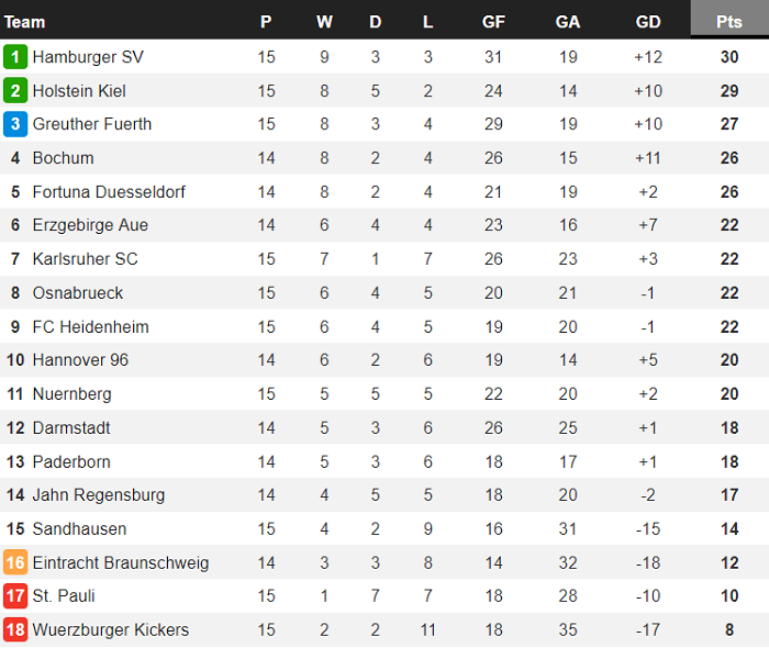 Bảng xếp hạng Bundesliga 2 mới nhất