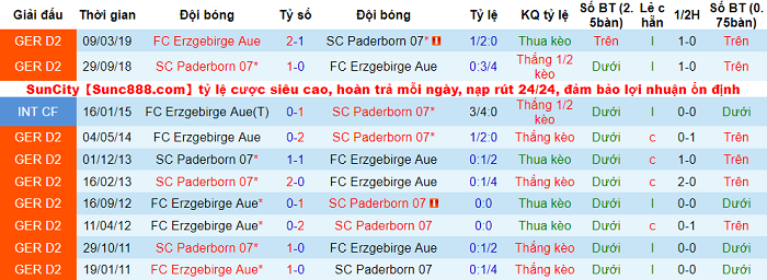 Paderborn thắng theo tỷ lệ châu Á tới 7/10 lần so tài gần nhất với Erzgebirge Aue. Cái duyên đối đầu này nhiều khả năng được Paderborn thể hiện vào Chủ nhật.