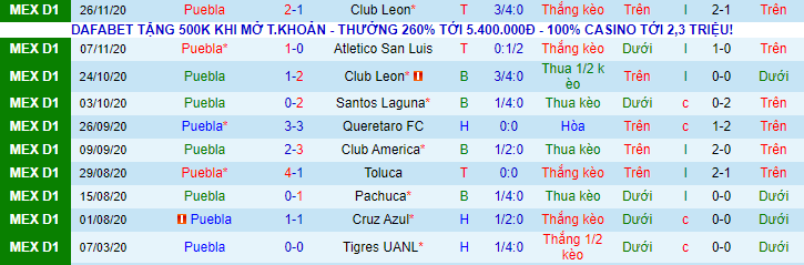 + Thống kê 10 trận gần nhất của Puebla