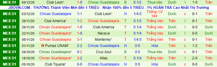 + Thống kê 10 trận gần nhất của Guadalajara Chivas