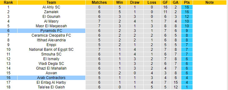 Nhưng nếu quan sát kỹ, giới mộ điệu nhận thấy Pyramids và Arab Contractors không có quá nhiều sự chênh lệch. Chi tiết hơn, Pyramids mới thắng 2, hoà 3 và để thua 1 trận. Lúc này, họ tạm thời hơn Arab Contractors 5 điểm song đã đá nhiều hơn 1 trận.