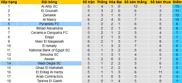 Trong khi đó Wadi Degla chỉ đang đứng thứ 15, ngay trên nhóm các đội cầm đèn đỏ với 5 điểm có được cũng sau 5 vòng đấu. Hiện tại Wadi Degla chỉ đang hơn đội đứng sau El Entag El Harby 1 điểm cũng như hơn đội áp chót Al Mokawloon 2 điểm.