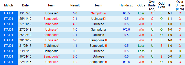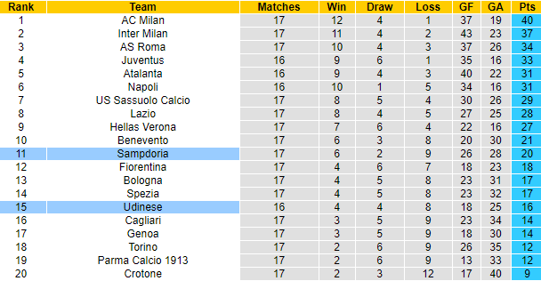 Sampdoria toàn thắng cả 3 trận đối đầu Udinese gần đây tại Serie A. Trên sân nhà, 3 lần tiếp đón Udinese trước đó, Sampdoria cũng đều giành 3 điểm tối đa, xé lưới đối thủ 8 lần. Trên bảng xếp hạng Serie A lúc này, Sampdoria xếp trên Udinese 4 bậc. Cụ thể, Sampdoria xếp thứ 11 với 20 điểm, Udinese xếp thứ 15 với 16 điểm. Tuy nhiên ở trận đấu sắp tới, Udinese lại là đội nhận được sự tin tưởng vào khả năng giành chiến thắng.