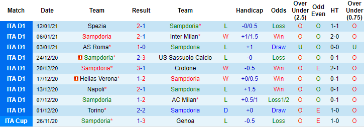 + Thống kê 10 trận gần nhất của Sampdoria