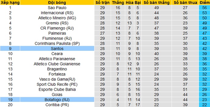 Trong khi đó Botafogo đang phải vật lộn ở vị trí bét bảng xếp hạng khi mới có được 23 điểm sau 29 vòng đấu. Hiện Botafogo đang kém đội áp chót Coritiba 2 điểm nhưng còn cách nhóm các đội trụ hạng tới 9 điểm.
