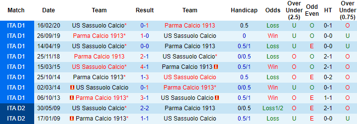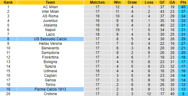 Parma được coi là cái dớp của Sassuolo. 4 lần chạm trán Sassuolo gần đây trong khuôn khổ Serie A, Parma bất bại với 3 chiến thắng và 1 trận hòa. 2 lần gần nhất tiếp đón Parma trên sân nhà, Sassuolo thậm chí còn không thể ghi nổi 1 bàn thắng.