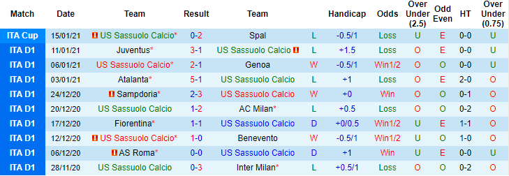 + Thống kê 10 trận gần nhất của Sassuolo