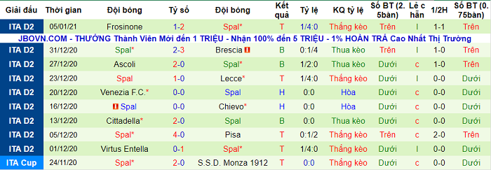 - Thống kê 10 trận gần nhất của SPAL