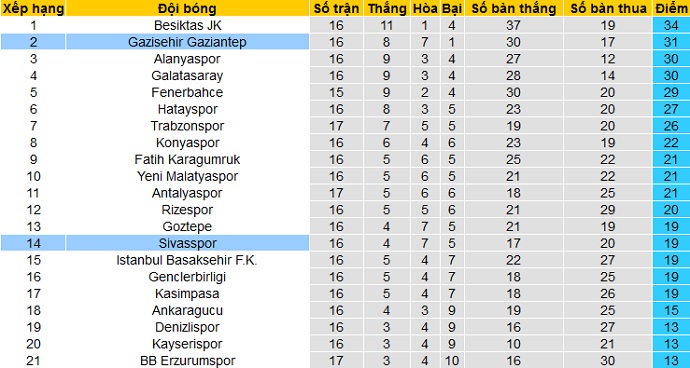 Bảng xếp hạng giải VĐQG Thổ Nhĩ Kỳ trước vòng 17