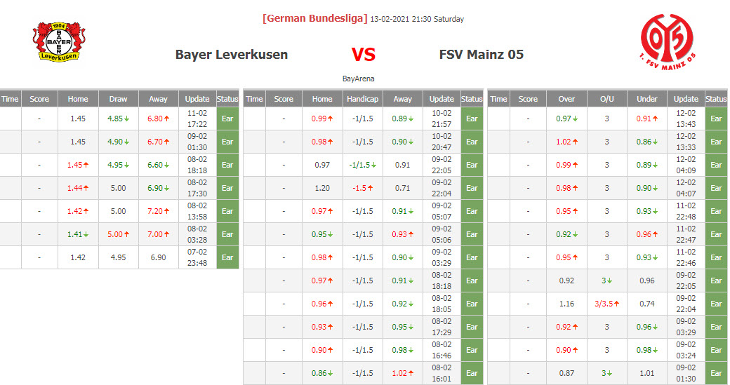 Ngay tại thời điểm định mức lợi nhuận được công khai, giới điều hành dự đoán Leverkusen là đội bóng sẽ giành chiến thắng trước Mainz. Chính xác hơn, họ dự đoán đội bóng thành Leverkusen sẽ thắng với tỷ số cách biệt khi đưa ra kèo chấp thắng một thua nửa (-1 1/4).