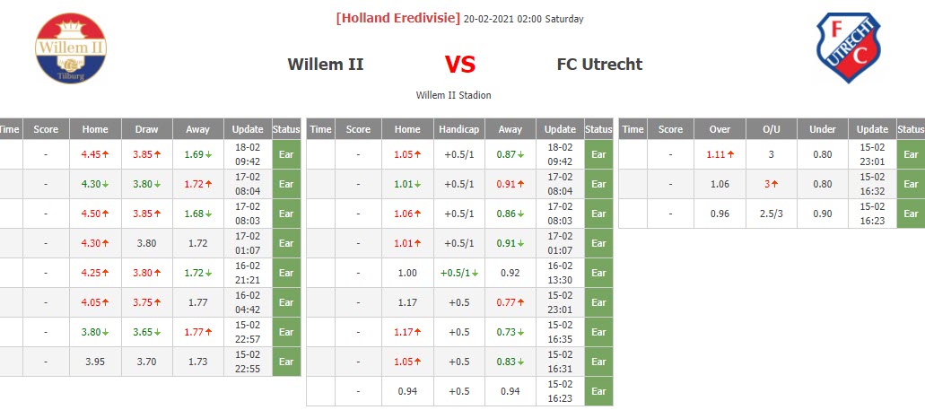 BIẾN ĐỘNG TỶ LỆ KÈO CHẤP WILLEM VS UTRECHT