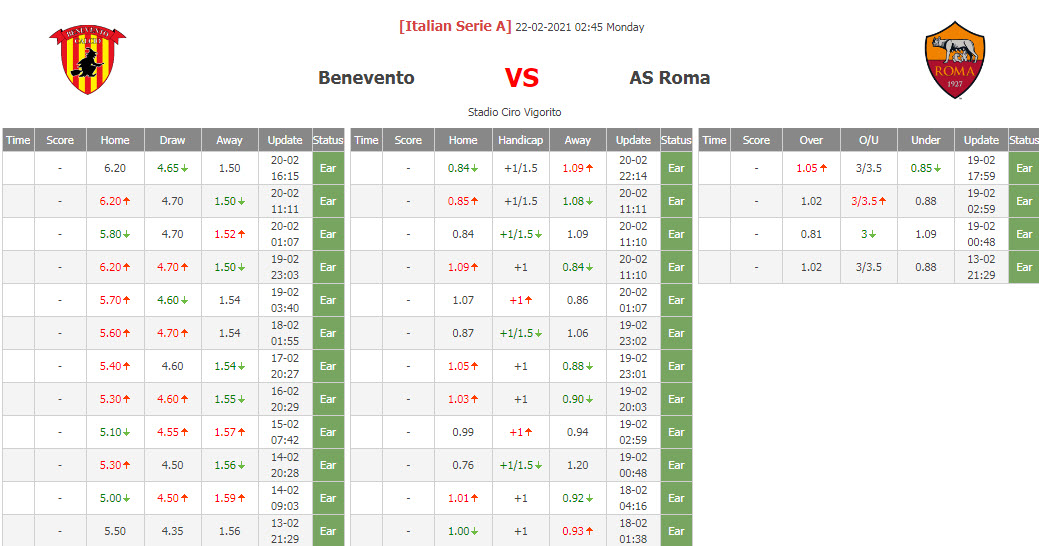 BIẾN ĐỘNG TỶ LỆ KÈO CHẤP BENEVENTO VS ROMA