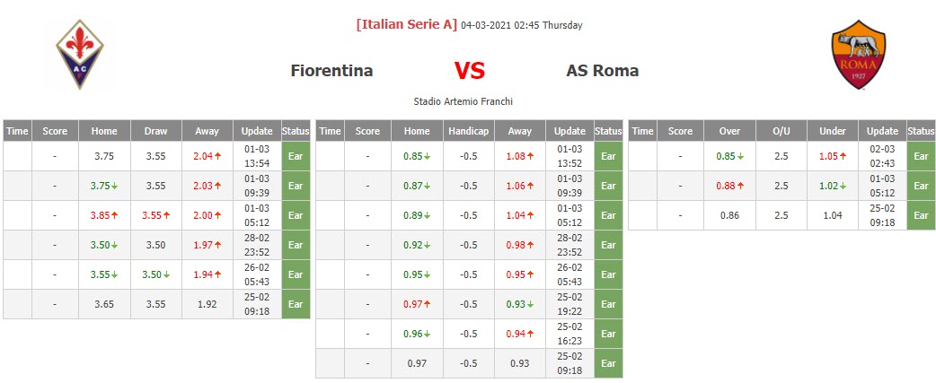BIẾN ĐỘNG TỶ LỆ KÈO CHẤP FIORENTINA VS ROMA
