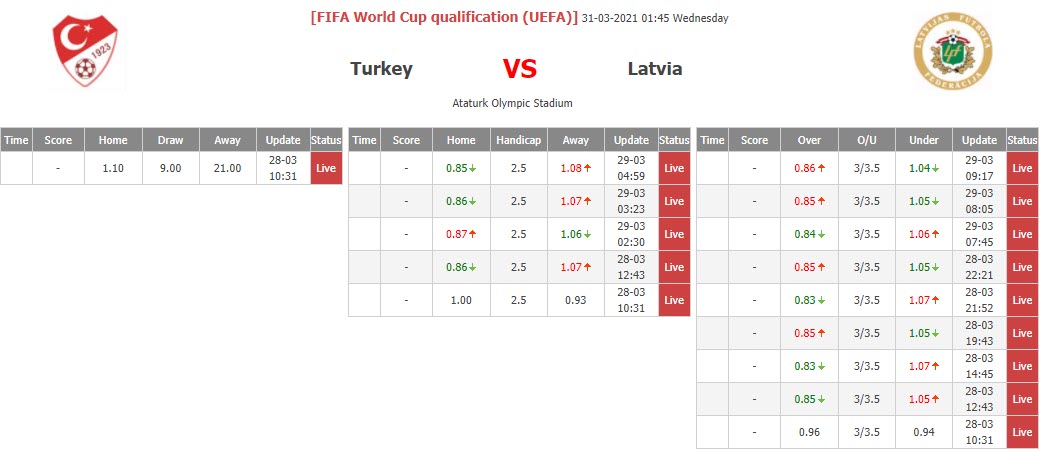 Ngay tại thời điểm công khai tỷ lệ cược của trận đấu giữa Thổ Nhĩ Kỳ và Latvia, giới điều hành châu Á đã khiến không ít người chơi phỉa bất ngờ khi đưa ra kèo chấp lên tới thắng hai đứt (-2 1/2) dành cho đội chủ nhà.