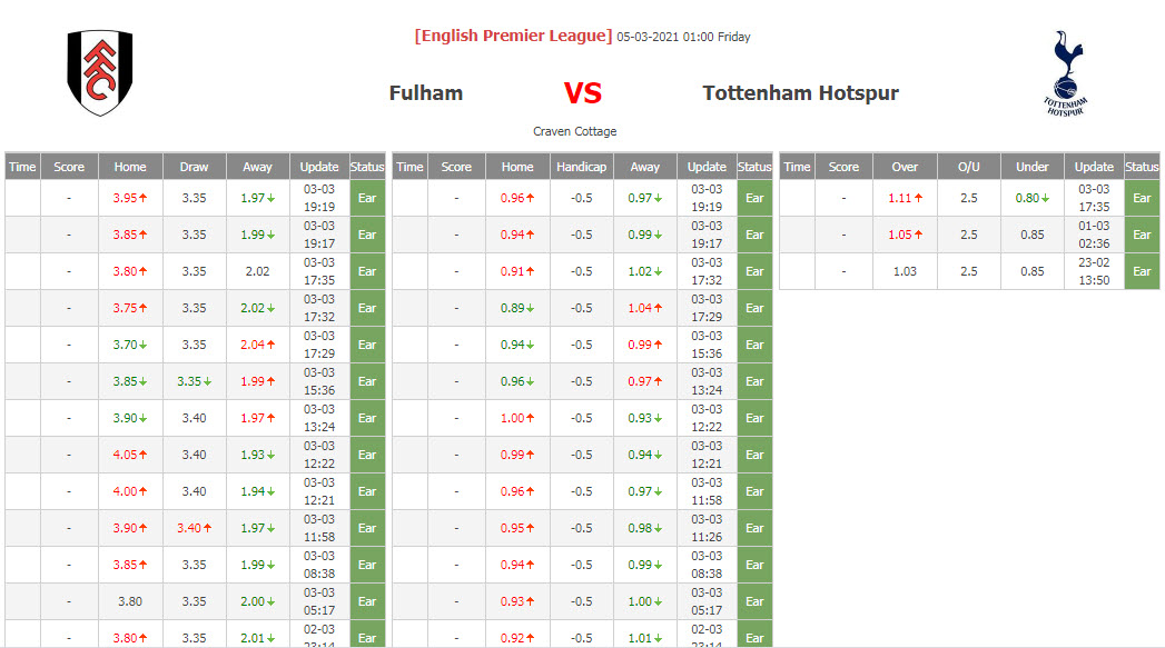 BIẾN ĐỘNG TỶ LỆ KÈO CHẤP FULHAM VS TOTTENHAM