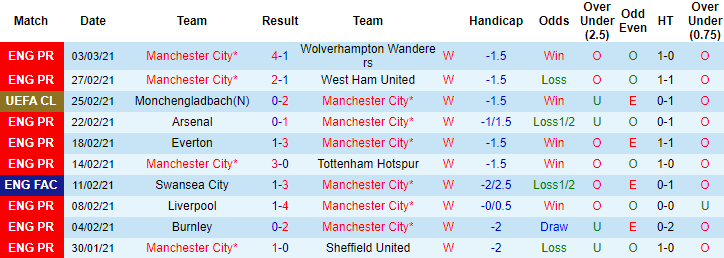 + Thống kê 10 trận gần nhất của Man City