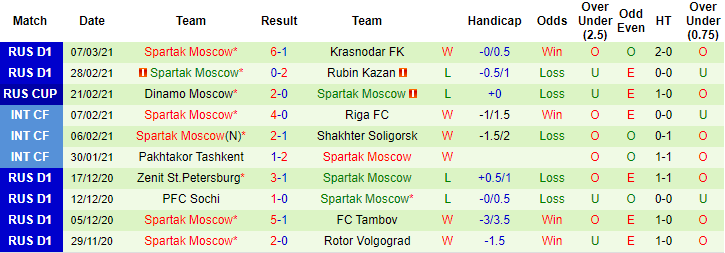 + Thống kê 10 trận gần nhất của Spartak