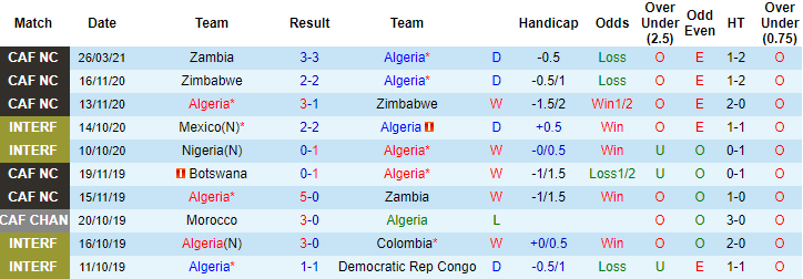 + Thống kê 10 trận gần nhất của Algeria